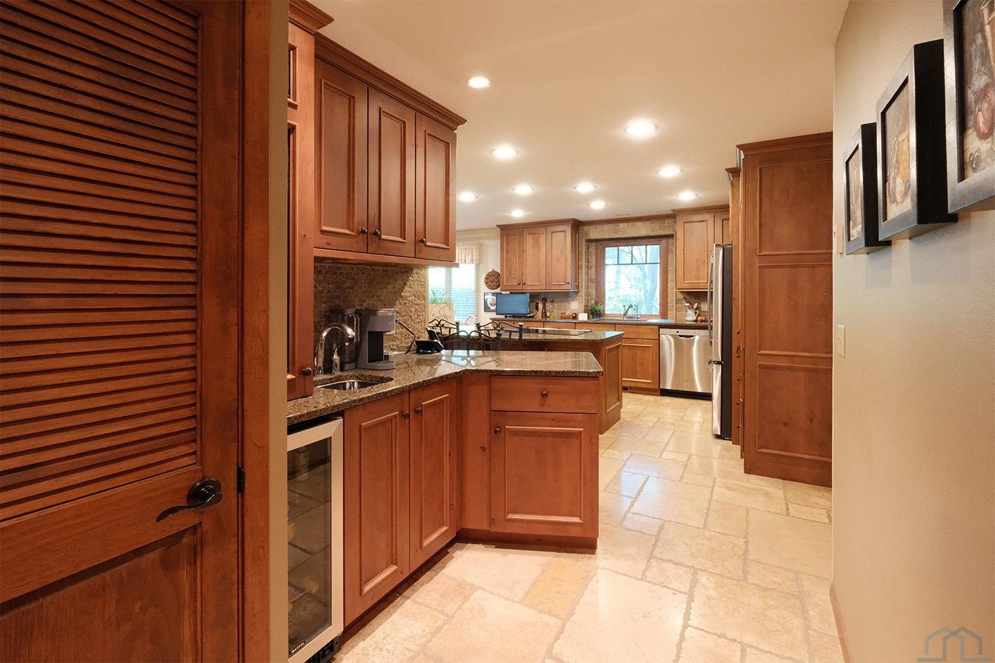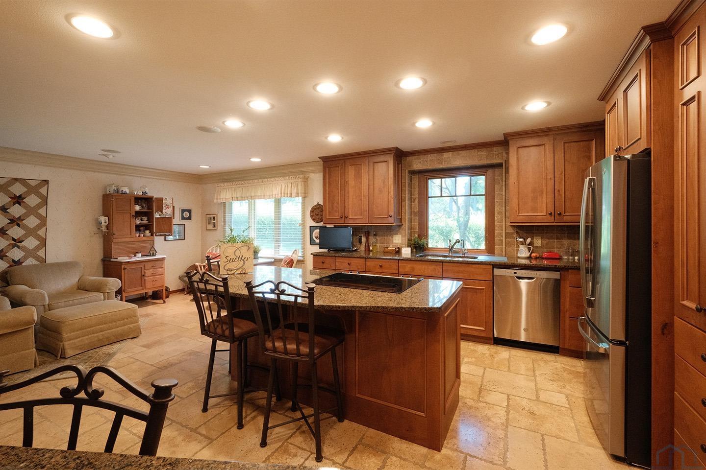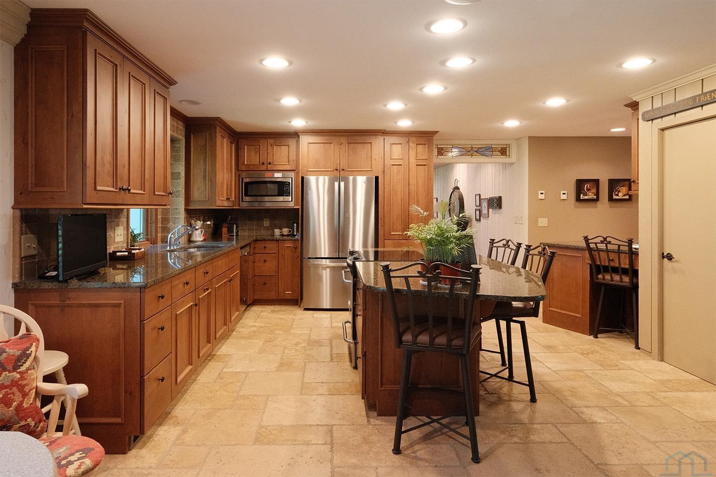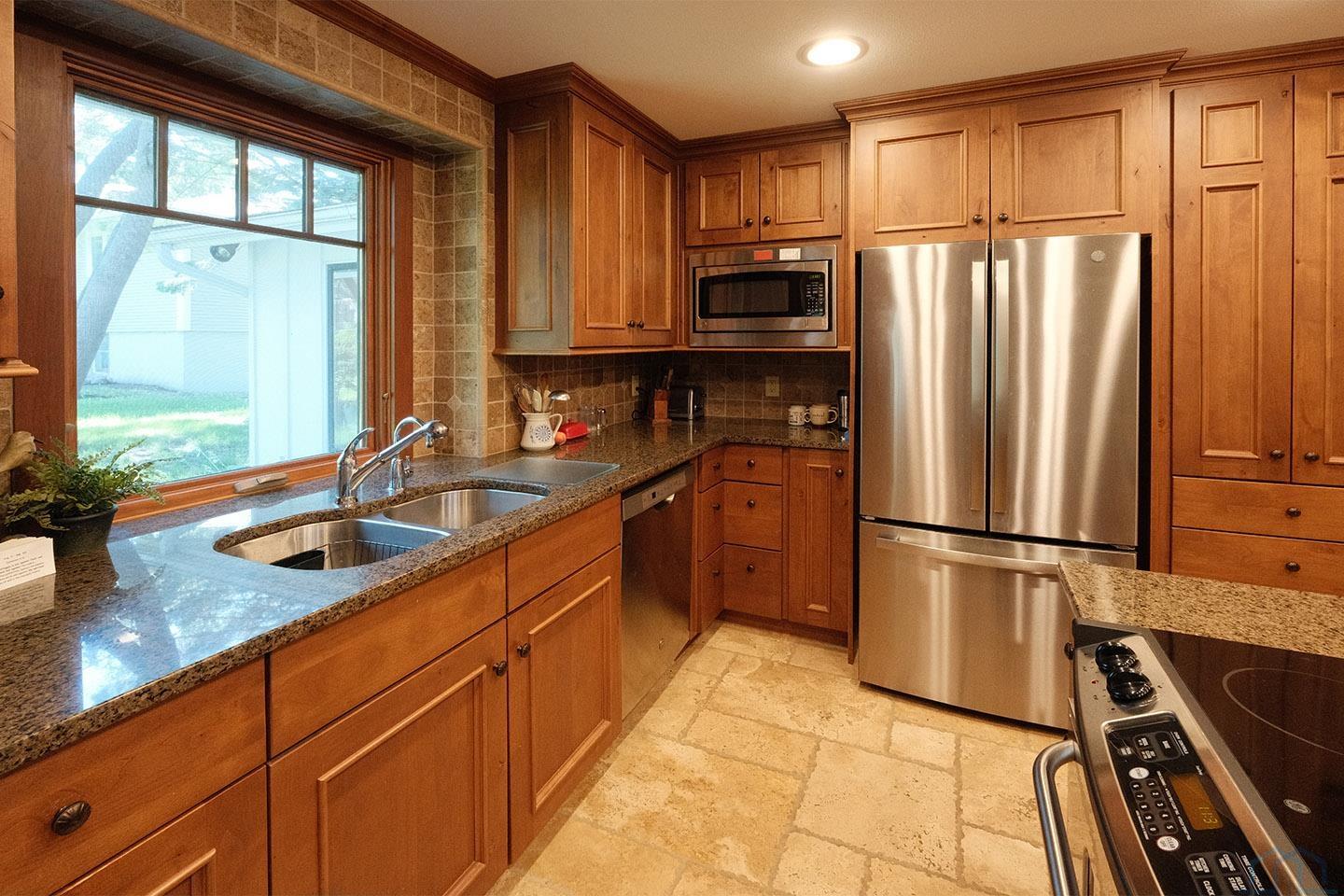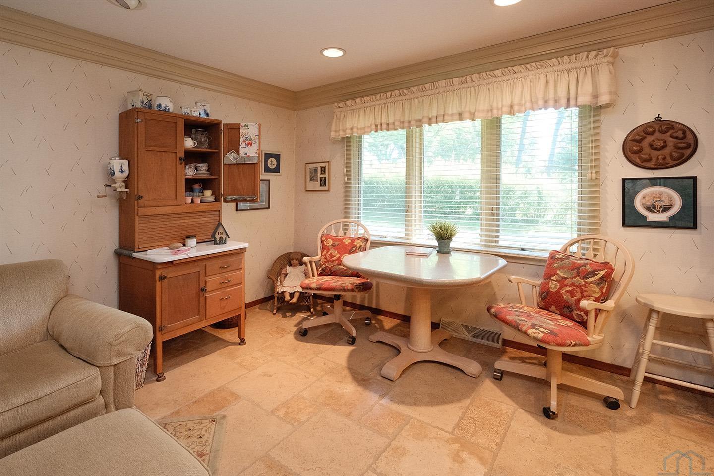 Packed with charm and every quality of home, this property has it all; undeniable curb appeal, tremendous location, tasteful updates and finishes, meticulous care, and functional living !This 2 story home is nestled in the heart of Sioux Center, with direct access to bike trails, schools and parks! Built in 1972, this home is situated on a spacious corner lot, featuring a serene streetscape with cedar/brick siding, inviting front porch, meticulously cared for lawn, trees and landscaping, along with 2 stall attached garage. This home greets you upon entry with functional and homey foyer! The main floor is thoughtfully designed with several details including beautiful travertine tile heated floors throughout and ample living space; large family room with wood burning fireplace, open concept kitchen with granite countertops and custom cherry cabinetry, wet bar with wine fridge, cozy den space, large formal dining, primary bedroom with full bath en-suite and walk-in closet! Upstairs offers additional living space with 4 bedrooms and full bath! The full basement is unfinished, but offers ample space for finished living spaces; family room, bathroom, laundry and storage, along with a workshop area and exterior access! You don’t want to miss the cozy screened in porch and paver patio – the perfect space to relax and unwind! Move in ready and all appliances included!